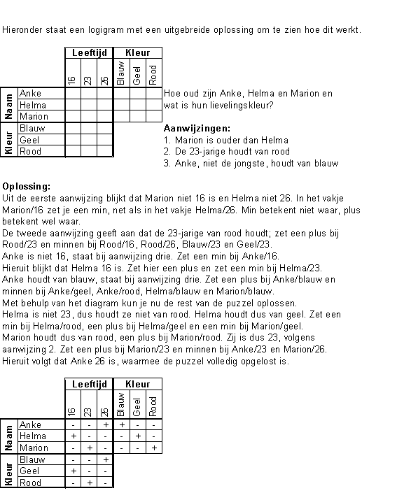 Als je wilt weten hoe je een logigram oplost, heb ik hier een voorbeeld.